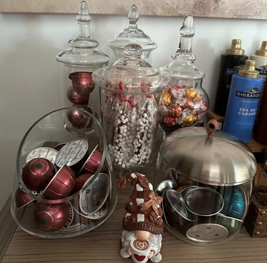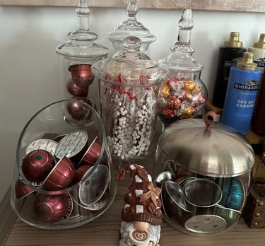 Apothecary Jars: Use these for storing coffee beans, sugar, pods, or other accessories. These jars can also be used to store chocolate and snacks such as biscotti's & cookies.