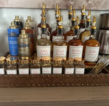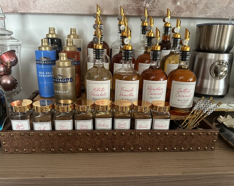 Glass Syrup Bottles & Sprouts: Store flavored syrups (vanilla, caramel, hazelnut) for personalized drinks.
